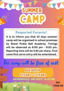 It is to inform you that 10 days summer camp will be organised in school premises by Shoot Pickle Ball Academy. Timings will be observed as 6:00 pm – 9:00 pm.Reporting time will be 5:45 pm sharp.